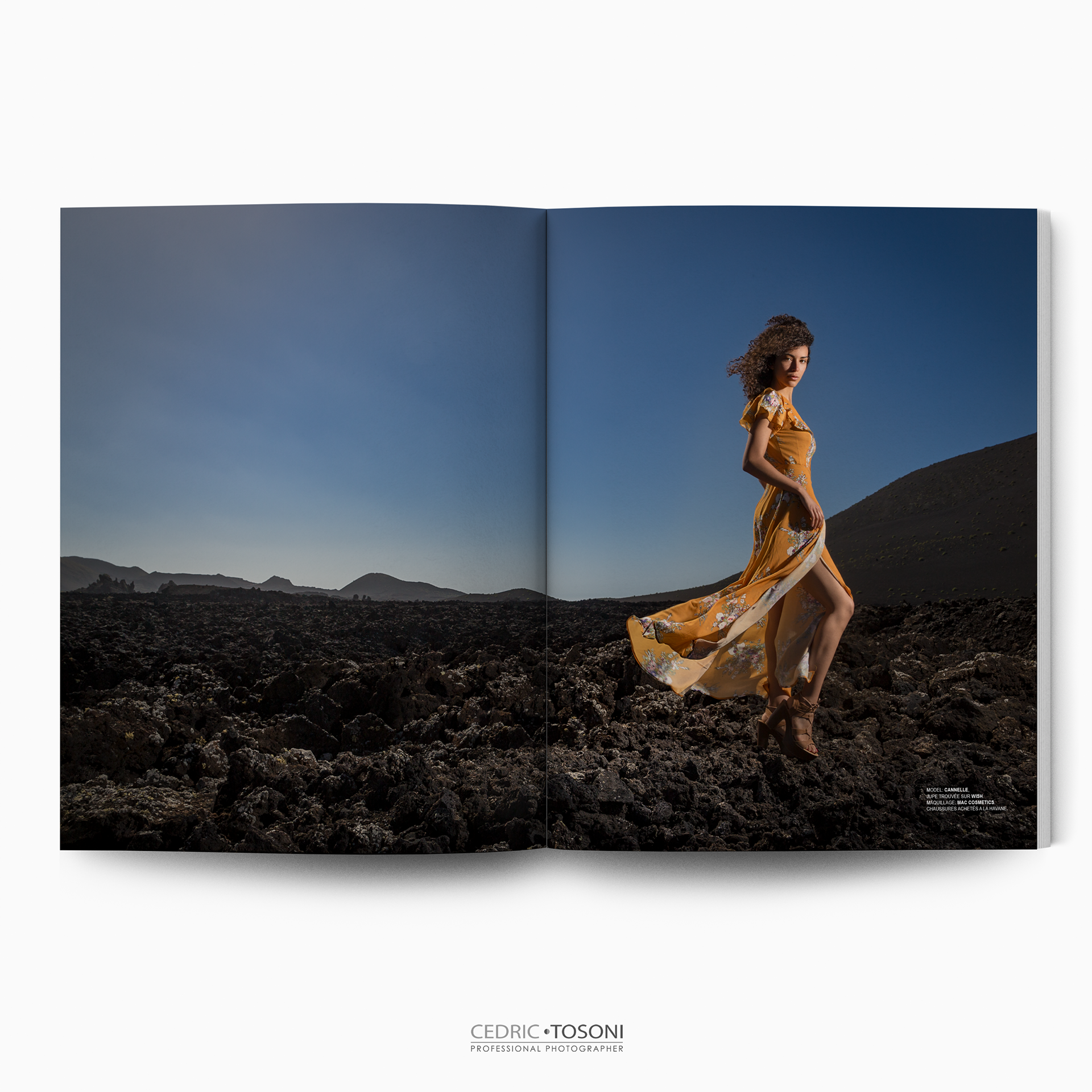 After kilometers of trekking, the faithful hiking shoes and backpacks made way for haute couture creations amidst the volcanic stones that carve this lunar landscape.”